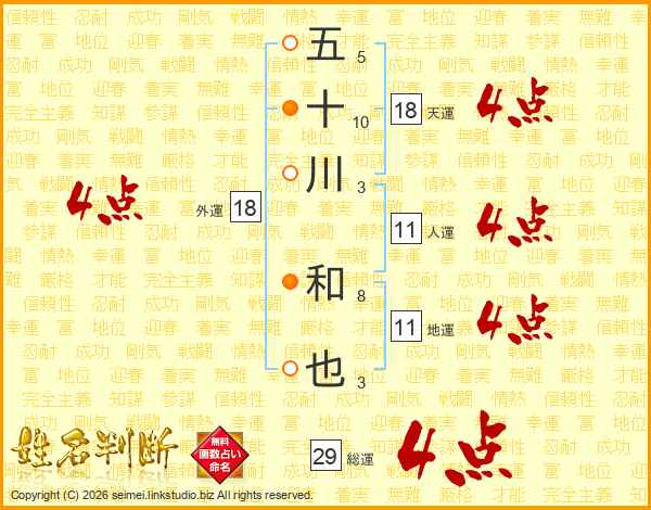 五(5画)十(10画)川(3画) 和(8画)也(3画)