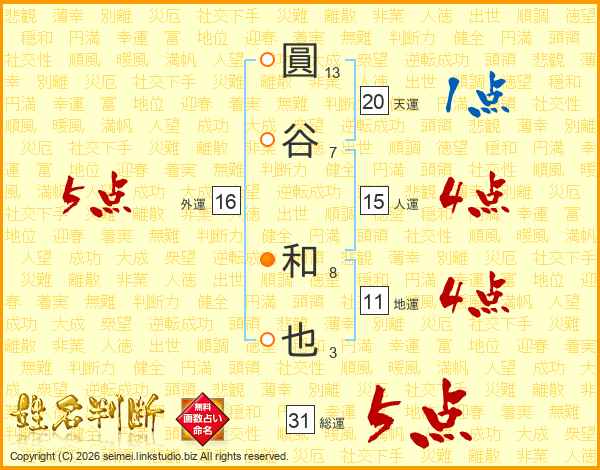 生活面を象徴する運勢です。外部から受ける影響力を表し、結婚運、家庭運や職場、環境への順応性を表します。総運から人運を引いた画数。姓や名が1文字の場合を除く。