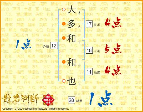 生活面を象徴する運勢です。外部から受ける影響力を表し、結婚運、家庭運や職場、環境への順応性を表します。総運から人運を引いた画数。姓や名が1文字の場合を除く。