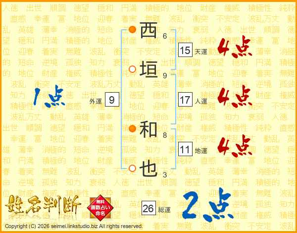 西垣和也さんの総運は26画の2点!