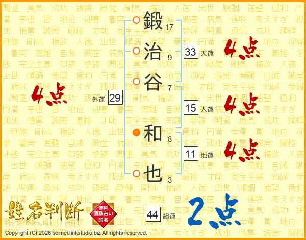 鍛治谷和也さんの総運は44画の2点!