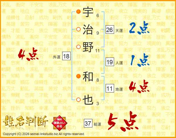 宇治野和也さんの天運は26画の2点!