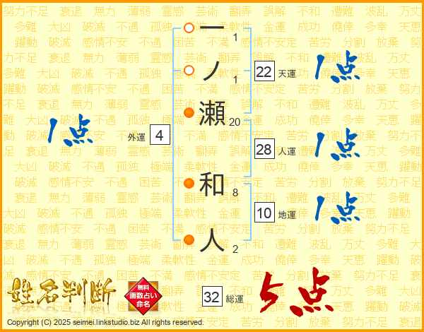 一(1画)ノ(1画)瀬(20画) 和(8画)人(2画)