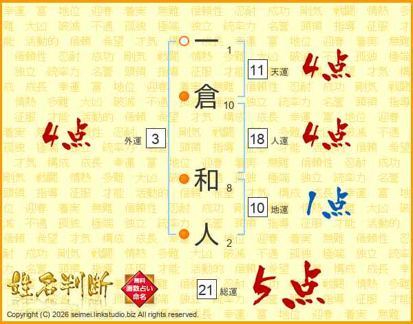 生活面を象徴する運勢です。外部から受ける影響力を表し、結婚運、家庭運や職場、環境への順応性を表します。総運から人運を引いた画数。姓や名が1文字の場合を除く。