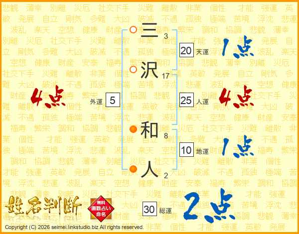 生活面を象徴する運勢です。外部から受ける影響力を表し、結婚運、家庭運や職場、環境への順応性を表します。総運から人運を引いた画数。姓や名が1文字の場合を除く。
