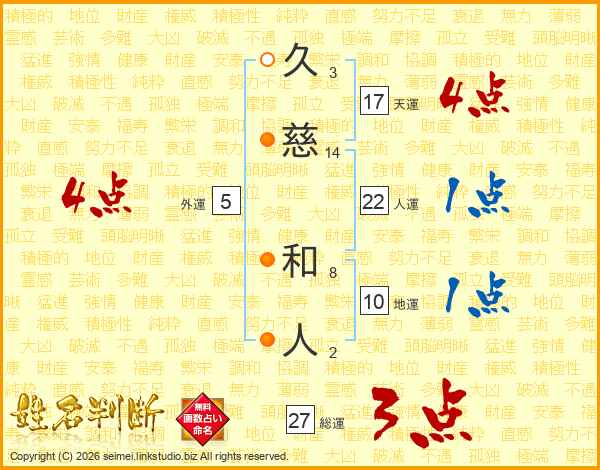 生活面を象徴する運勢です。外部から受ける影響力を表し、結婚運、家庭運や職場、環境への順応性を表します。総運から人運を引いた画数。姓や名が1文字の場合を除く。