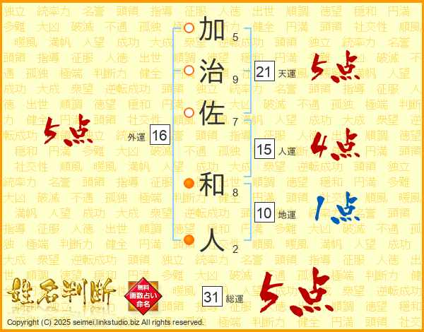 加(5画)治(9画)佐(7画) 和(8画)人(2画)