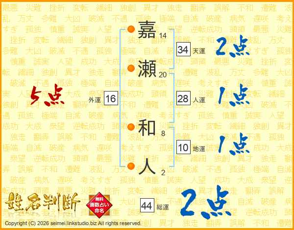 嘉瀬和人さんの総運は44画の2点!