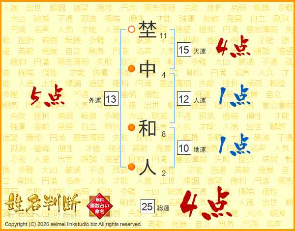 生活面を象徴する運勢です。外部から受ける影響力を表し、結婚運、家庭運や職場、環境への順応性を表します。総運から人運を引いた画数。姓や名が1文字の場合を除く。