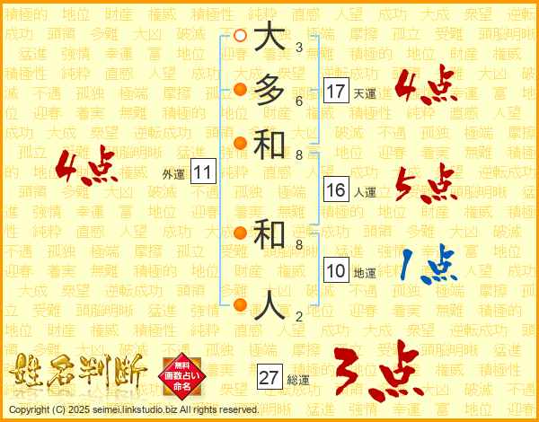 生活面を象徴する運勢です。外部から受ける影響力を表し、結婚運、家庭運や職場、環境への順応性を表します。総運から人運を引いた画数。姓や名が1文字の場合を除く。
