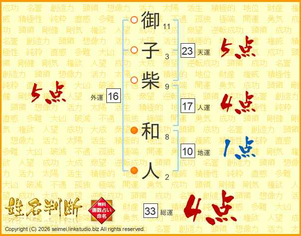 御(11画)子(3画)柴(9画) 和(8画)人(2画)