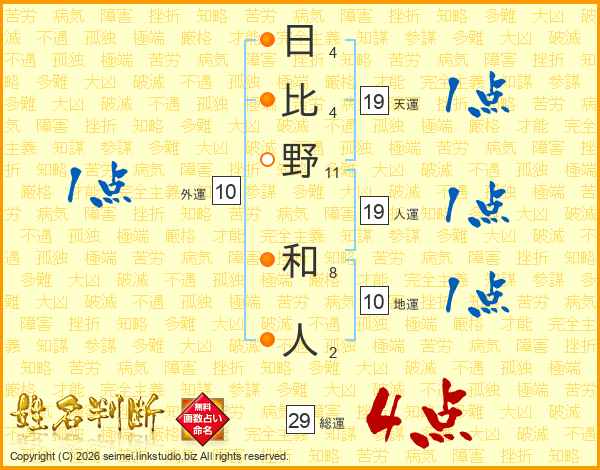 日(4画)比(4画)野(11画) 和(8画)人(2画)