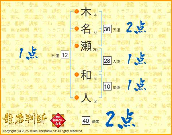 木(4画)名(6画)瀬(20画) 和(8画)人(2画)