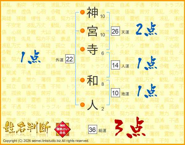 神(10画)宮(10画)寺(6画) 和(8画)人(2画)