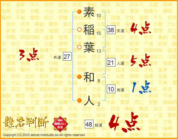 素(10画)稲(15画)葉(13画) 和(8画)人(2画)