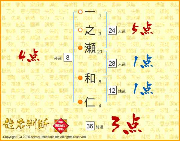 一(1画)之(3画)瀬(20画) 和(8画)仁(4画)