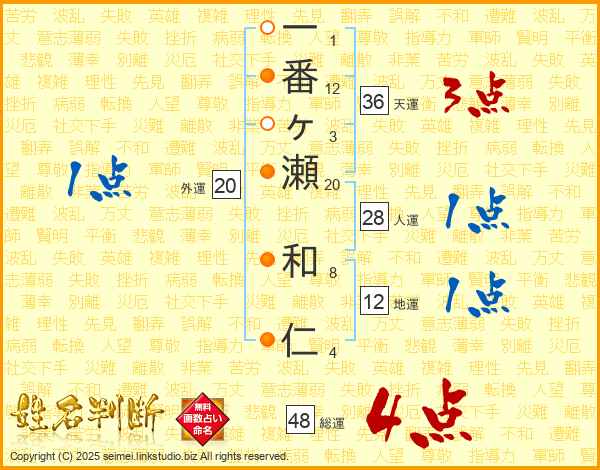 一番ヶ瀬和仁さんの総運は48画の4点!