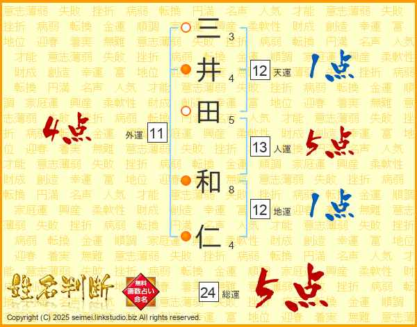 三(3画)井(4画)田(5画) 和(8画)仁(4画)