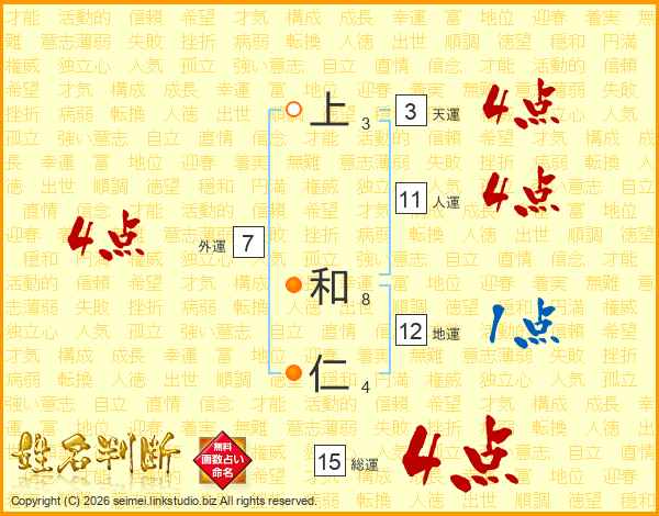 生活面を象徴する運勢です。外部から受ける影響力を表し、結婚運、家庭運や職場、環境への順応性を表します。総運から人運を引いた画数。姓や名が1文字の場合を除く。