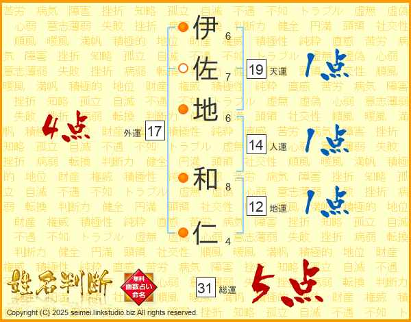 伊(6画)佐(7画)地(6画) 和(8画)仁(4画)