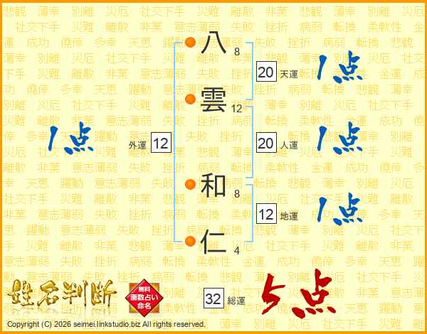 生活面を象徴する運勢です。外部から受ける影響力を表し、結婚運、家庭運や職場、環境への順応性を表します。総運から人運を引いた画数。姓や名が1文字の場合を除く。