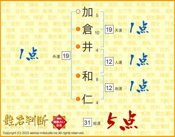 加(5画)倉(10画)井(4画) 和(8画)仁(4画)