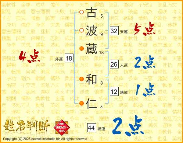 古(5画)波(9画)蔵(18画) 和(8画)仁(4画)
