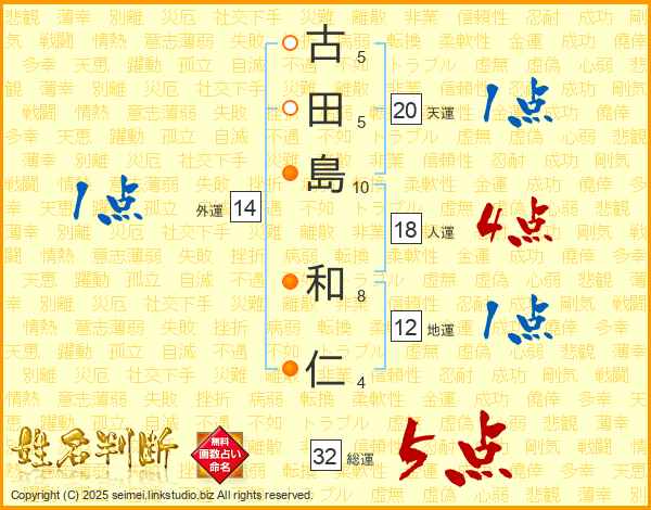 古(5画)田(5画)島(10画) 和(8画)仁(4画)