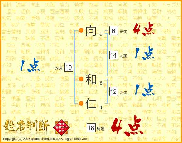 生活面を象徴する運勢です。外部から受ける影響力を表し、結婚運、家庭運や職場、環境への順応性を表します。総運から人運を引いた画数。姓や名が1文字の場合を除く。