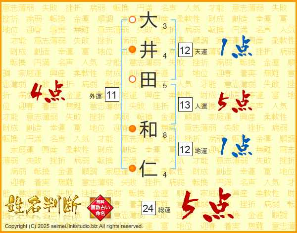 大(3画)井(4画)田(5画) 和(8画)仁(4画)