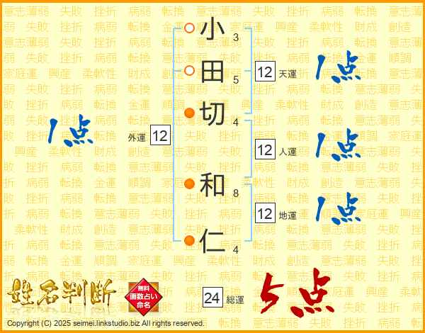 小(3画)田(5画)切(4画) 和(8画)仁(4画)