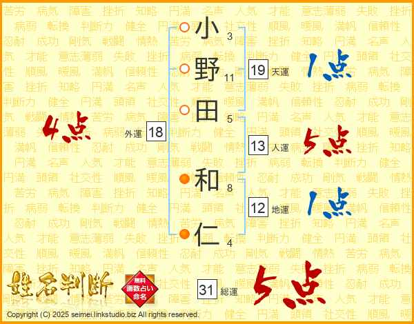 小(3画)野(11画)田(5画) 和(8画)仁(4画)