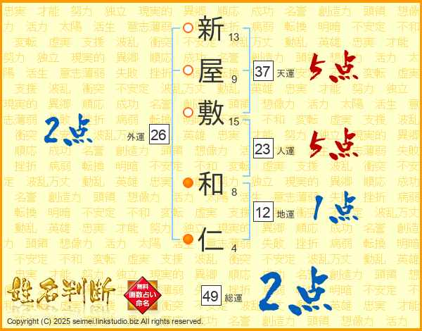 新(13画)屋(9画)敷(15画) 和(8画)仁(4画)
