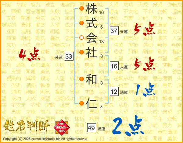 株(10画)式(6画)会(13画)社(8画) 和(8画)仁(4画)