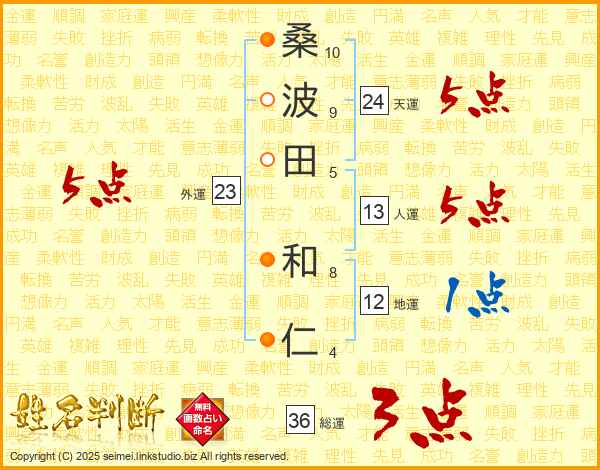 桑(10画)波(9画)田(5画) 和(8画)仁(4画)