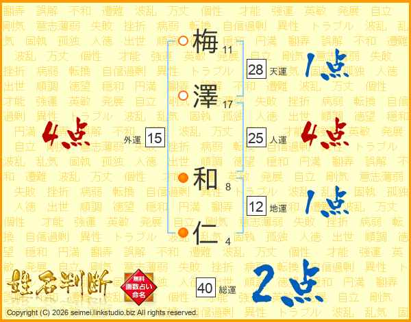 梅(11画)澤(17画) 和(8画)仁(4画)