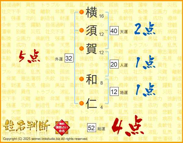 横(16画)須(12画)賀(12画) 和(8画)仁(4画)