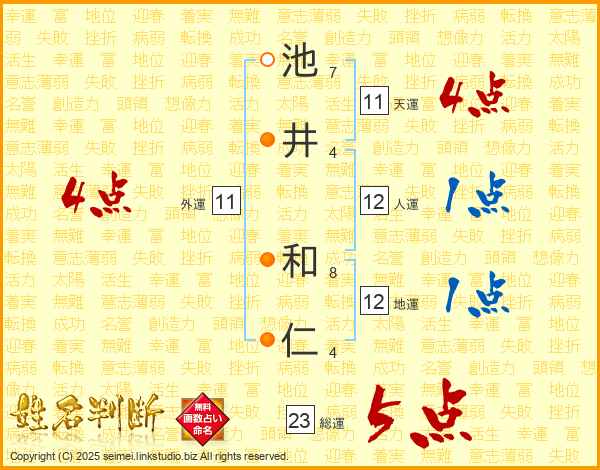 生活面を象徴する運勢です。外部から受ける影響力を表し、結婚運、家庭運や職場、環境への順応性を表します。総運から人運を引いた画数。姓や名が1文字の場合を除く。