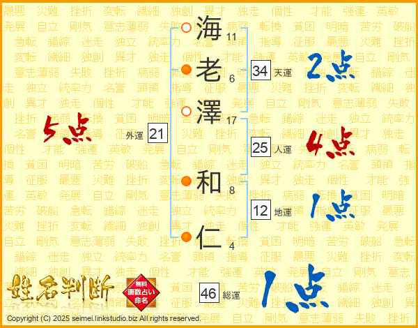 海(11画)老(6画)澤(17画) 和(8画)仁(4画)