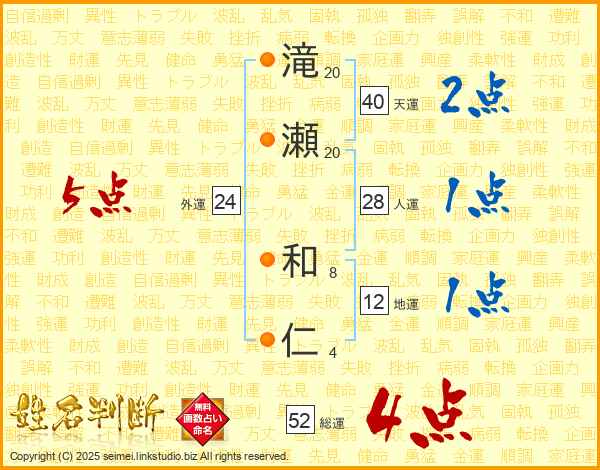滝(20画)瀬(20画) 和(8画)仁(4画)