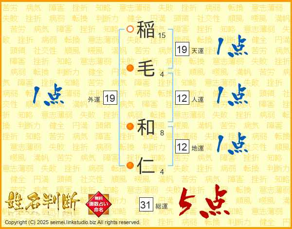 稲(15画)毛(4画) 和(8画)仁(4画)