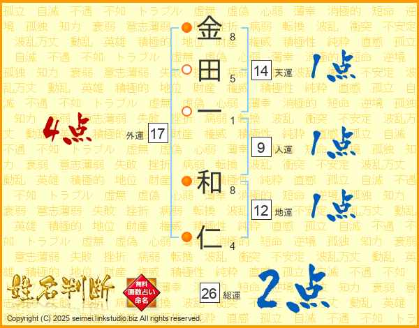 金(8画)田(5画)一(1画) 和(8画)仁(4画)