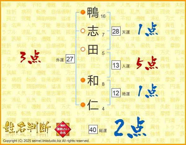 鴨(16画)志(7画)田(5画) 和(8画)仁(4画)