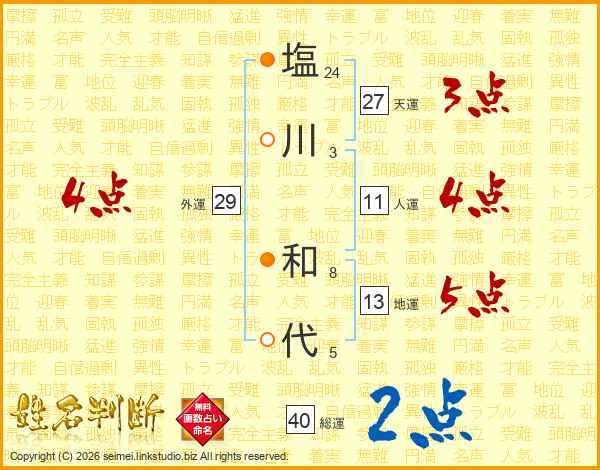 生活面を象徴する運勢です。外部から受ける影響力を表し、結婚運、家庭運や職場、環境への順応性を表します。総運から人運を引いた画数。姓や名が1文字の場合を除く。