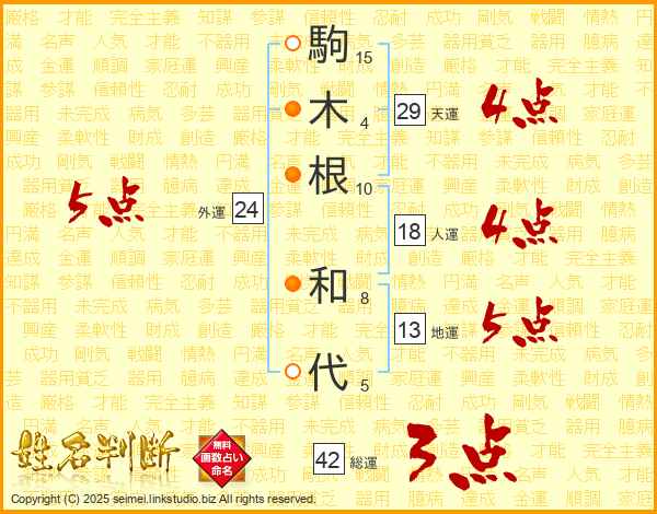 駒(15画)木(4画)根(10画) 和(8画)代(5画)