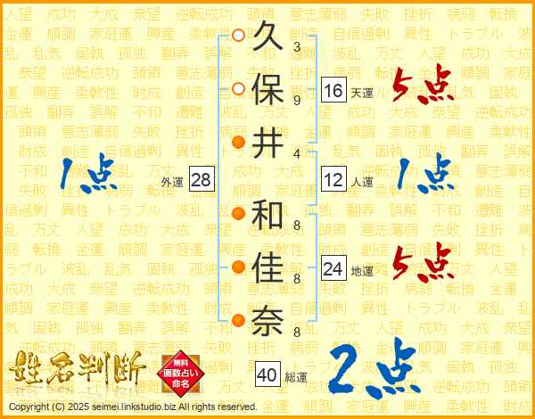 久(3画)保(9画)井(4画) 和(8画)佳(8画)奈(8画)