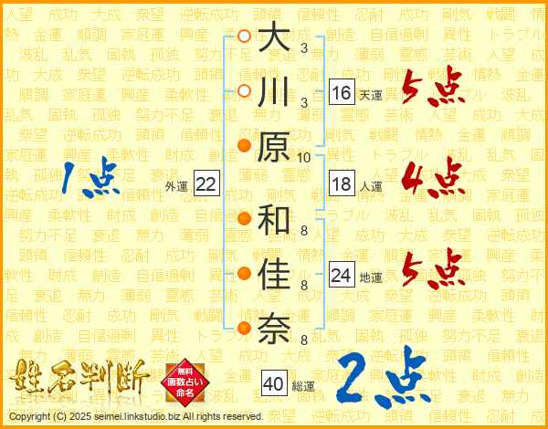 大(3画)川(3画)原(10画) 和(8画)佳(8画)奈(8画)