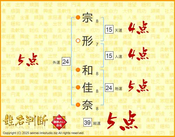 宗(8画)形(7画) 和(8画)佳(8画)奈(8画)