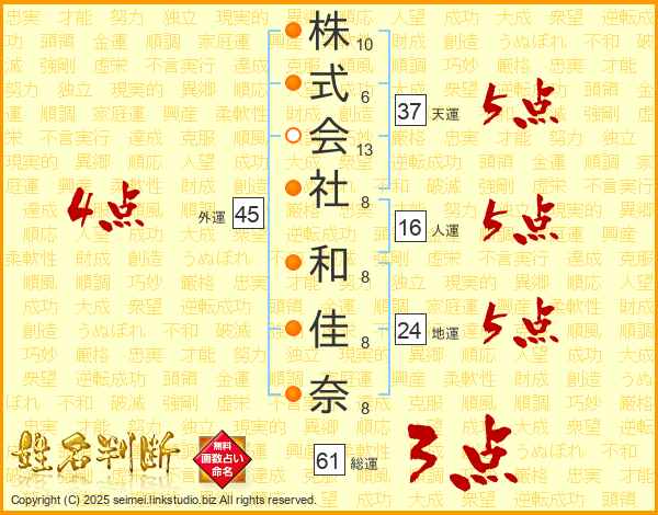 株(10画)式(6画)会(13画)社(8画) 和(8画)佳(8画)奈(8画)