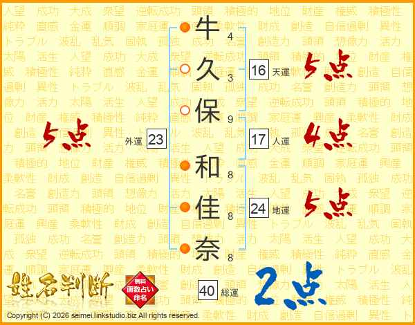 牛(4画)久(3画)保(9画) 和(8画)佳(8画)奈(8画)